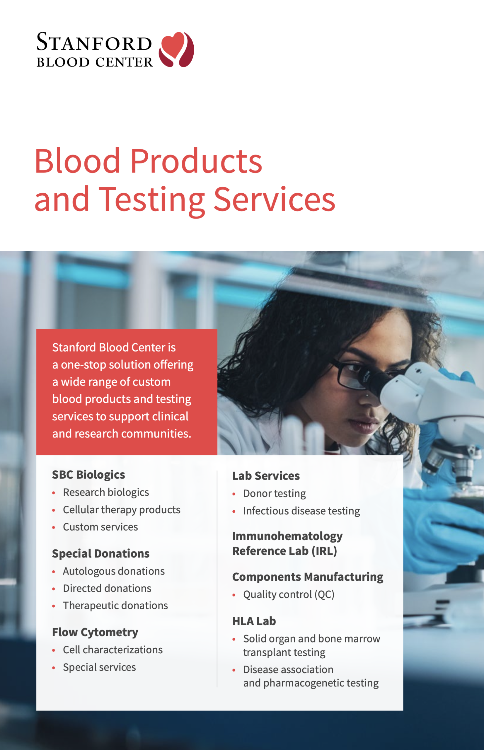 Stanford Blood Center is proud to support researchers within our community who are devoted to furthering the field of medicine and improving lives, as well as medical professionals working directly with patients to ascertain disease risk and transplant compatibility. No matter your aim, the SBC Biologics team is devoted to helping you find the exact product you need, and working with you one-on-one to meet all your specifications.